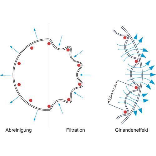Abreinigung erfolgt durch Druckluftimpulsstöße, die den Filter von innen nach außen abreinigen. Die dadurch hervorgerufene mechanische Verformung der Filter optimiert den Regenerationsgrad bei starker Verschmutzung.